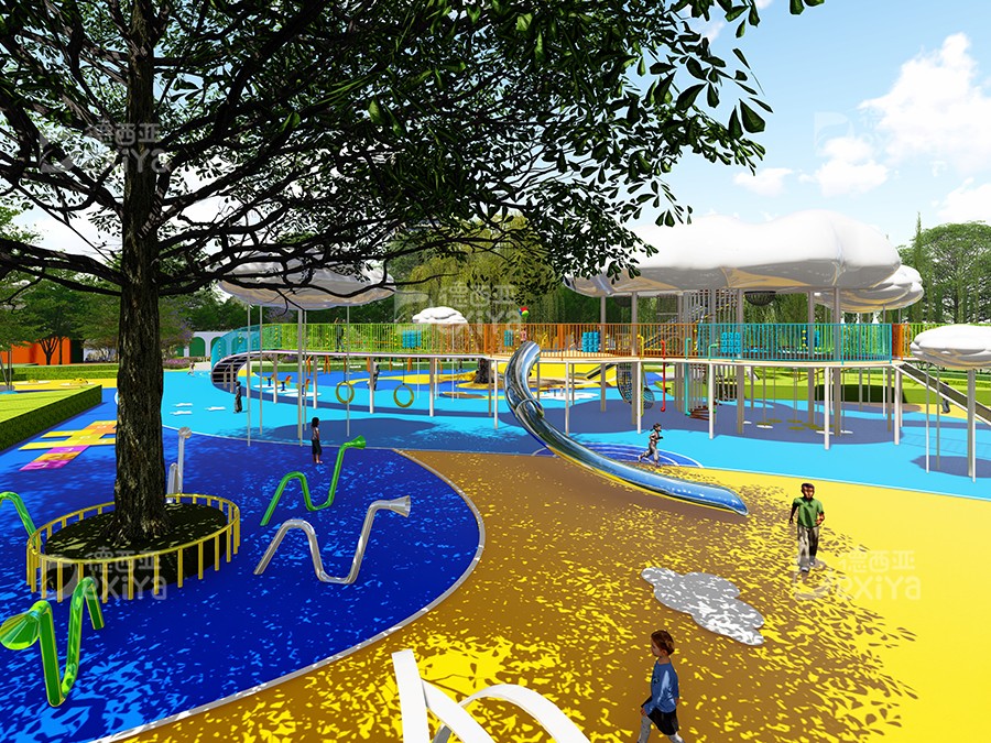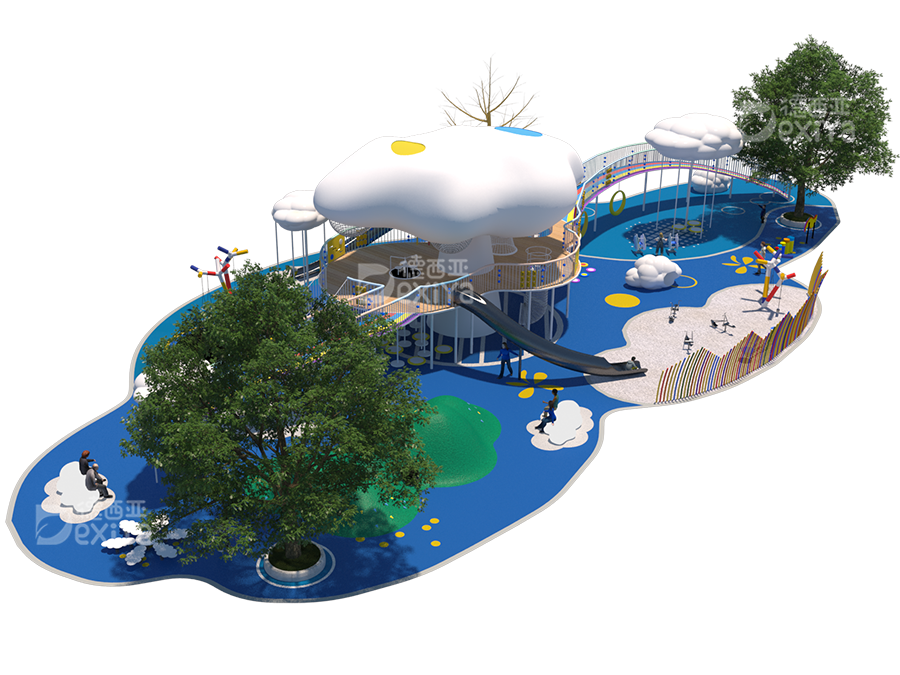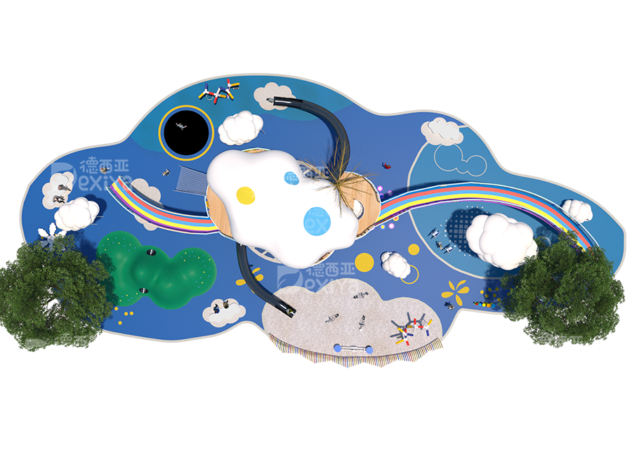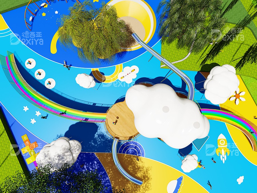 “探索,有趣,灵动”是德西亚本次设计的初衷,基于“云”的概念,融合了“彩虹”“山”“乐”“沙”等元素作为空间线索,诞生出一个充满想象与活力、梦幻与童趣的儿童乐园——云朵公园,在这里,孩子们可以在玩耍中成长,在互动中思考,像云朵一样自由,像彩虹一样耀眼。