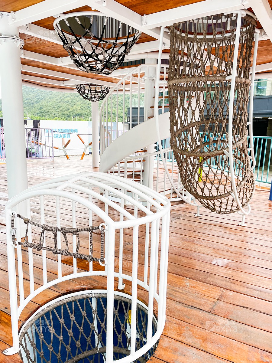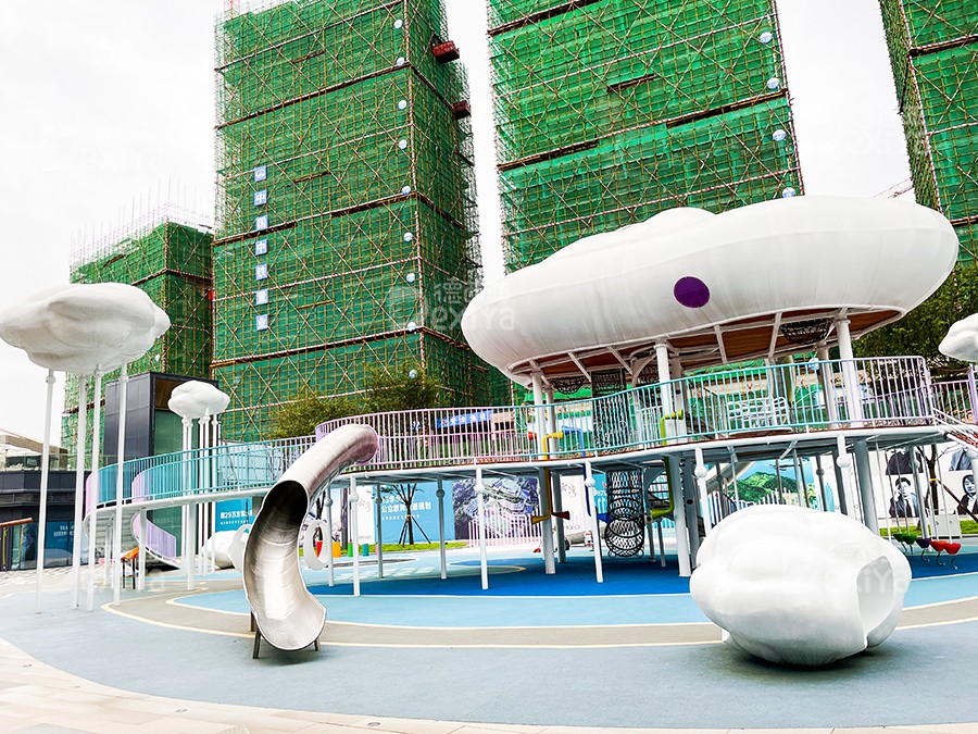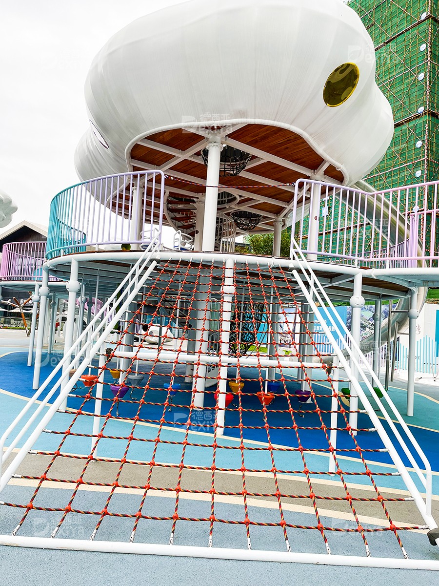 考虑到贯穿云朵主题,结合吊脚楼,我们打造了具有贵州特色的云朵屋,大的云朵屋总共三层,高达7.5米,大人与孩子们可以通过楼梯、钻笼,及攀爬网,到达二层及三层空间,然后从滑梯滑下,整个过程充满了趣味性及探险性。