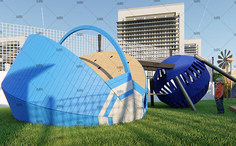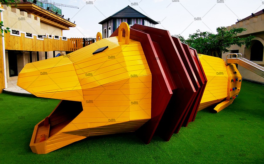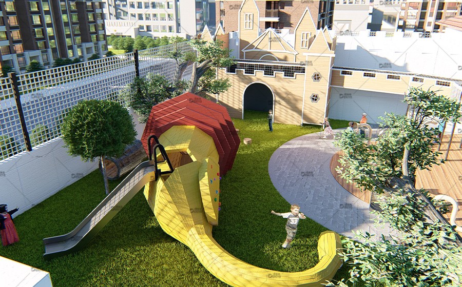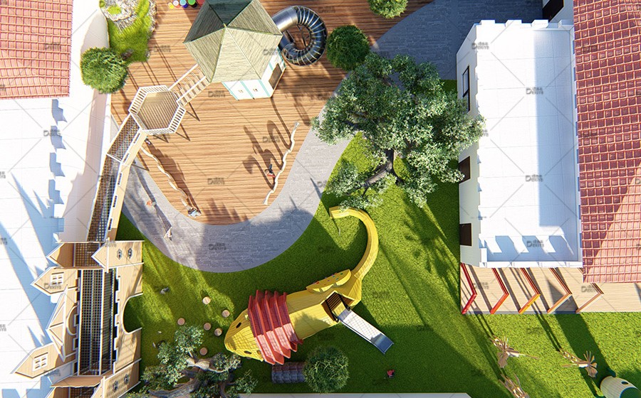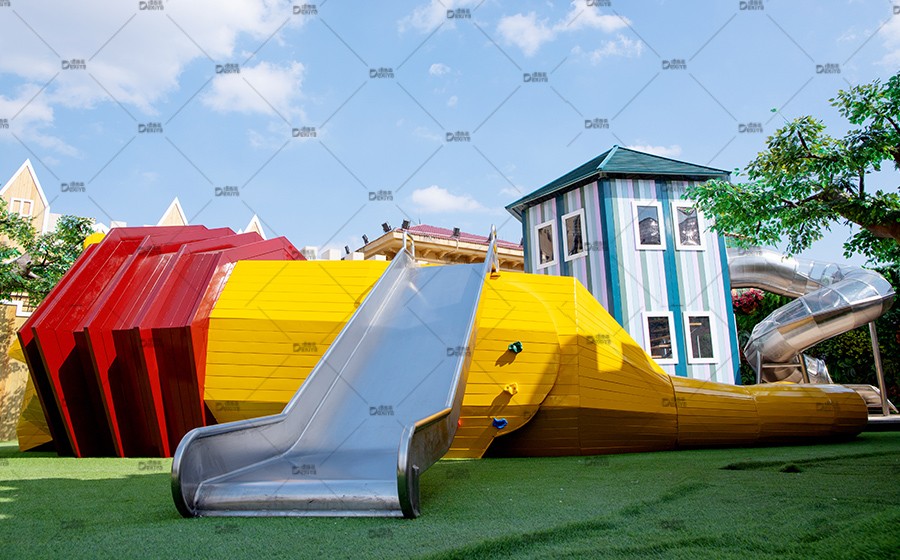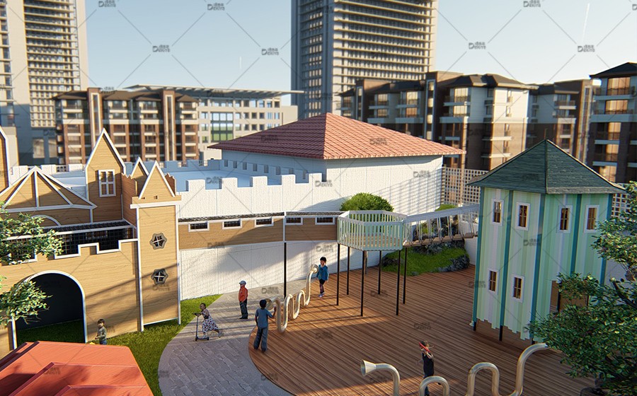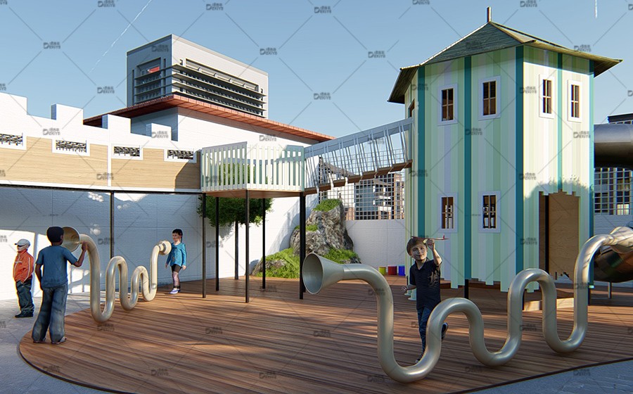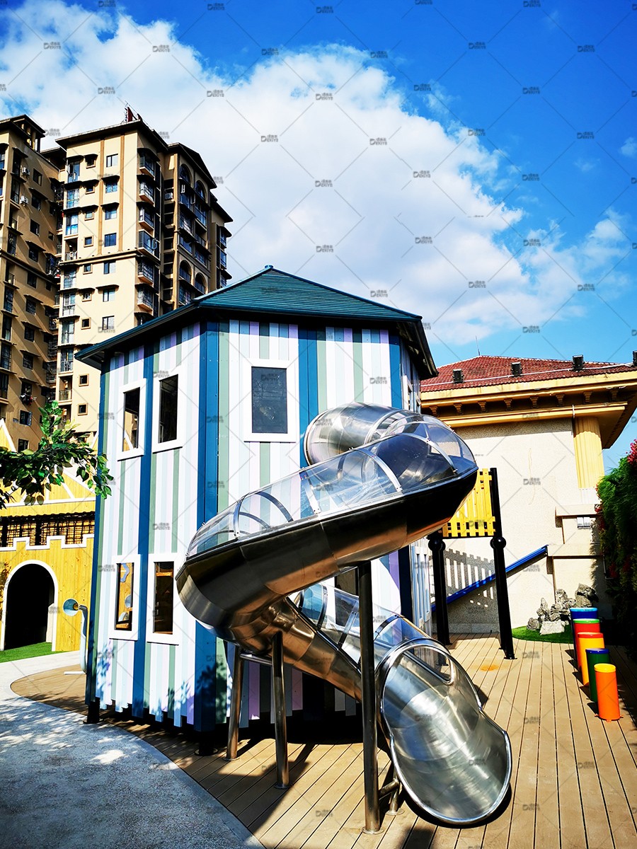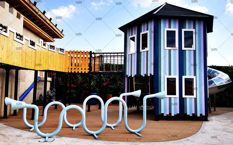 这座高高的"城堡",是孩子们专属的房子,孩子在穿行中感受不断变化的外部空间。采用“房子”+“攀爬绳”+“滑梯”模式,满足抓、攀、爬、滑等多种游乐需求,在房子和外部空间不断变换,更能满足探索欲,有助于大脑的发育。
