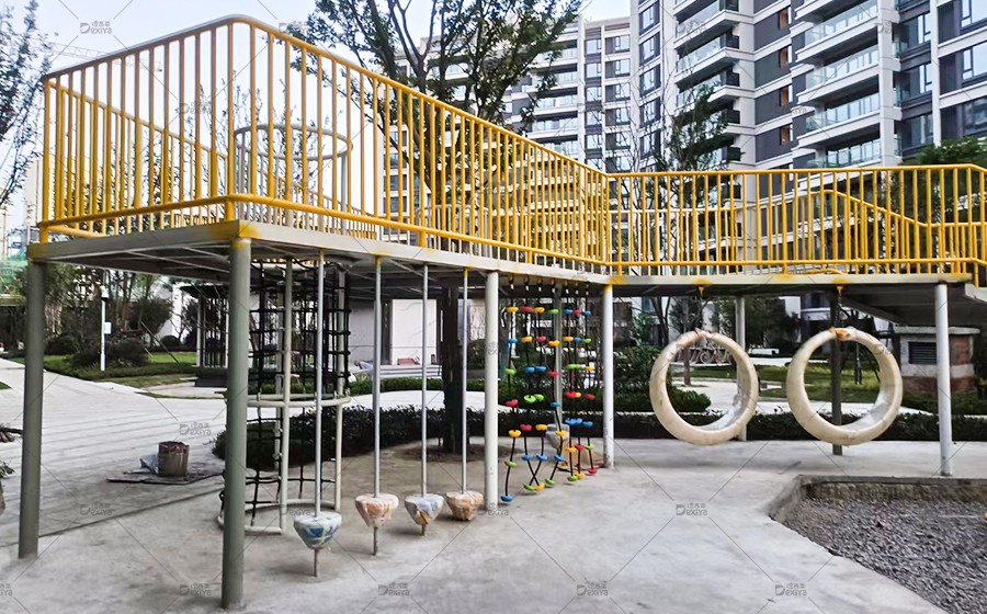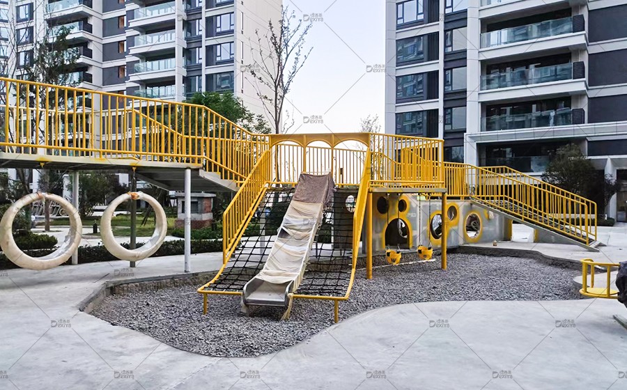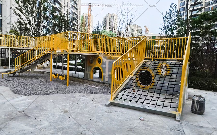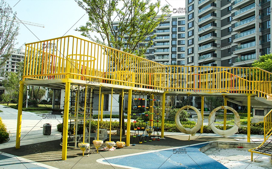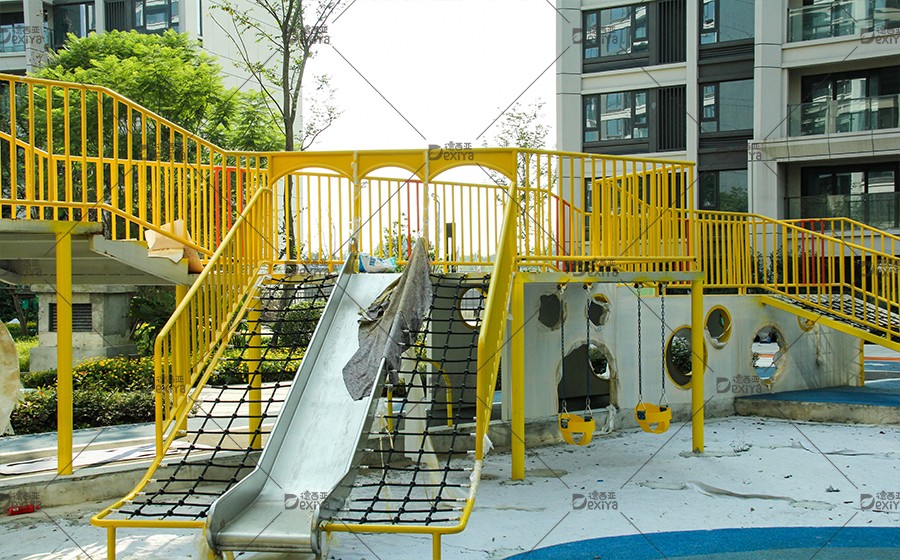 场地项目整体以柠檬黄为主色调,以滑梯、爬网、钻笼、踏桩、秋千、拱门及大型栈道平台相结合,视觉上非常抓人眼球。柠檬黄存在感非常强,让人感受到满满活力与勃勃生机,可以很好地调动小朋友们的积极性。德西亚设计师通过科学的立体组合,打造一个集游乐、益智、健身为一体的新一代儿童多功能体能拓展活动中心。他们可以通过攀、爬、钻、滑、荡等,锻炼身体的同时也掌握了平衡和手脚的协调能力。